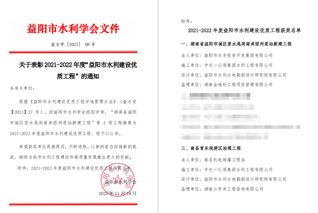 近日,益阳市水利学会公布了关于表彰2021-2022年度“益阳市水利建设优质工程”的通知,必威体育平台中国登陆入口,承建的湖南省益阳市城区资水尾闾南岸团洲泵站新建工程和南县育乐垸涝区治理工程榜上有名,被列为2021-2022年度益阳市水利建设优质工程。