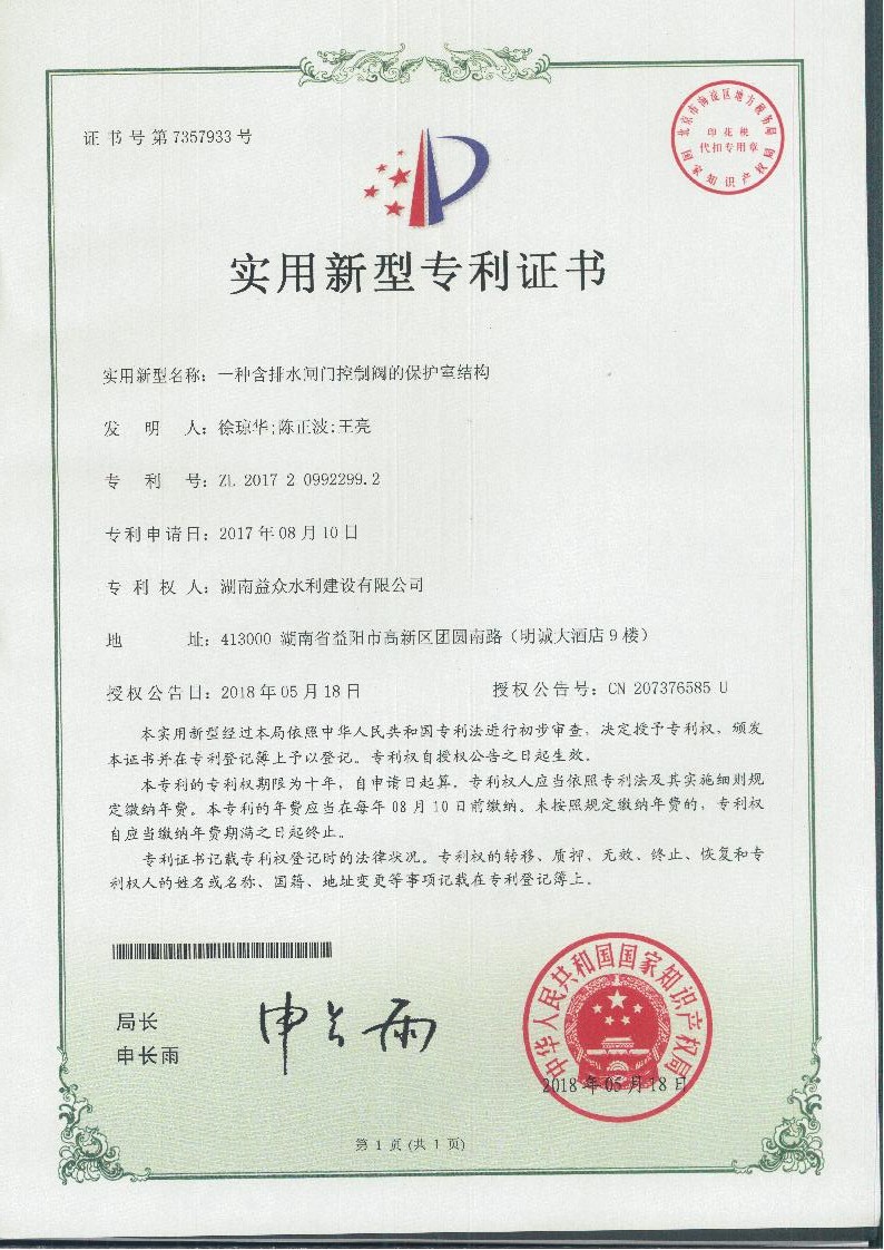 本实用新型公开了一种含排水闸门控制阀的保护室结构,包括排水闸门、控制阀和保护室结构,闸门通过连接杆与控制阀相连,控制阀固定设于保护室结构内,保护室结构包括保护室主体、保护室主体外侧壁上的置物间、保护室主体下部的台阶部和排水系统,排水系统包括中空阶部、L型钢管、三通管和排水管,中空阶部位于保护室主体底座和台阶部之间,中空阶部四面均开设有通孔且通过通孔穿设有四根L型钢管至中空阶部内,四根L型钢管通过三通管连接且三通管的一路正好与通孔相连通,其中三个三通管伸出通孔的一路上罩设有纱网盖,另一个三通管伸出通孔的一路上连接有排水管。本实用新型提供的一种含排水闸门控制阀的保护室结构,美观、安全且不易损。