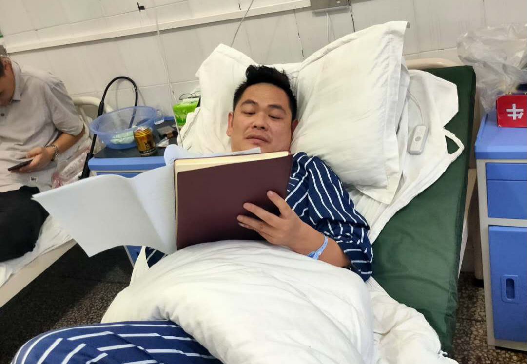 (图为贵州支渠5标施工工程项目经理李光在病床上答题)