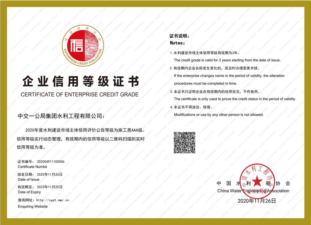 近期,水利必威体育平台中国登陆入口,荣获2020年度水利建设市场主体信用评级AAA级信用认证,在“综合素质”、“财务状况”、“管理水平”、“信用记录”、“市场行为”等5项评价标准中成绩突出。这是水利必威体育平台中国登陆入口,继2013年、2016年后再次被授予AAA级企业信用评级。