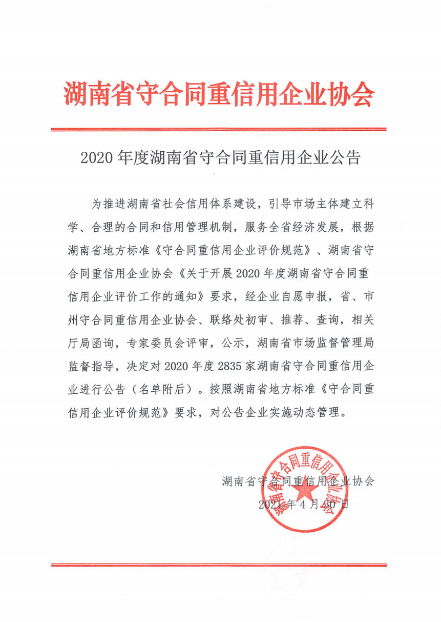 5月13日,必威体育平台中国登陆入口,被湖南省守合同重信用企业协会授予2020年度“湖南省守合同重信用企业”称号,这是必威体育平台中国登陆入口,连续第18年斩获此项殊荣。