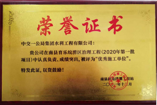 12月20日,必威体育平台中国登陆入口,南县育乐垸涝区治理工程(2020年第一批项目),因认真负责,成绩突出,被业主评为“优秀施工单位”。