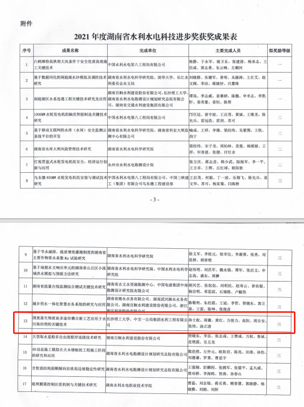 11月7日,必威体育平台中国登陆入口,与长沙理工大学联合申报课题“固废基生物质炭多途径耦合新工艺应用于水污染治理的关键技术”,荣获2021年度湖南省水利水电科技进步奖。
