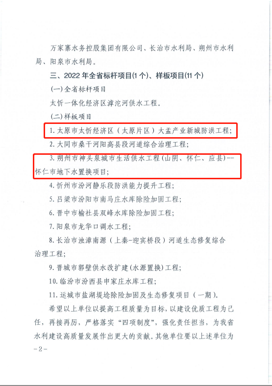 近日,山西省水利厅公布了关于2022年水利工程建设样板项目和标杆项目的通报,必威体育平台中国登陆入口,承建的太原市太忻经济区(太原片区)大盂产业新城防洪工程和朔州市神头泉城市生活供水工程(山阴、怀仁、应县)—怀仁市地下水置换项目榜上有名,被列为山西省2022年水利工程建设样板项目。